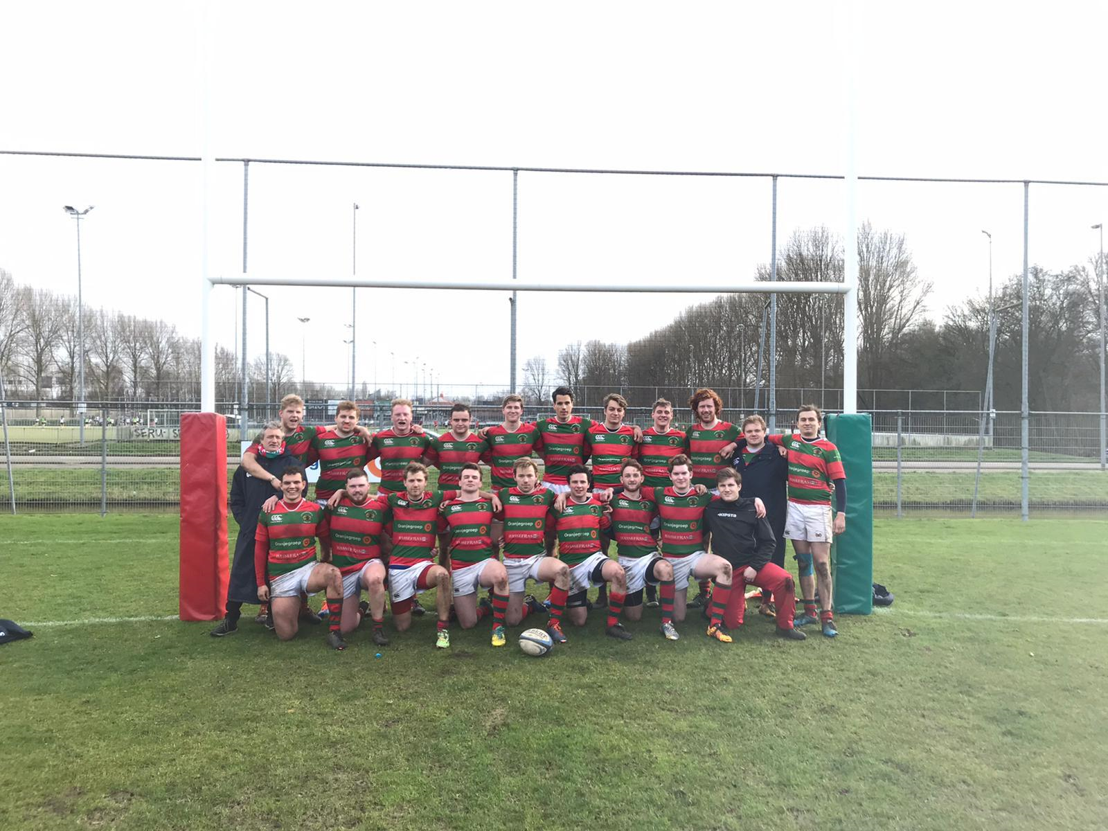The second half started, now with the wind in our back. We started strong again and made the gap in the score bigger through a break from Pelle, again. Tilburg started using their big forwards to crash and make meters in our 22-area. They managed to, after some very big defense from the forwards in red and green, secure their first points of the match. This was a wakeup call for us that the game was not over yet, and we asked second rower Pelle to tear the Tilburg defense apart once again, and he did; score 31-5. Tilburg tried the same tactic, and it worked again. They kept running into us, but after some amazing defense, with in particular our flanker Gianni Croes putting in some astonishing hits, they managed to score a try again. As the clock almost turned red, Waltdolph Knuppel broke through again to ground(???) the ball right next to the posts, to make the score 38-10. Tilburg did not give up and did exactly the same thing, only now they were awarded a penalty try after repeatedly failing to cross our tryline, which our forwards put their bodies on the line for, but failed to get onside on time once. Final score: 38-17.